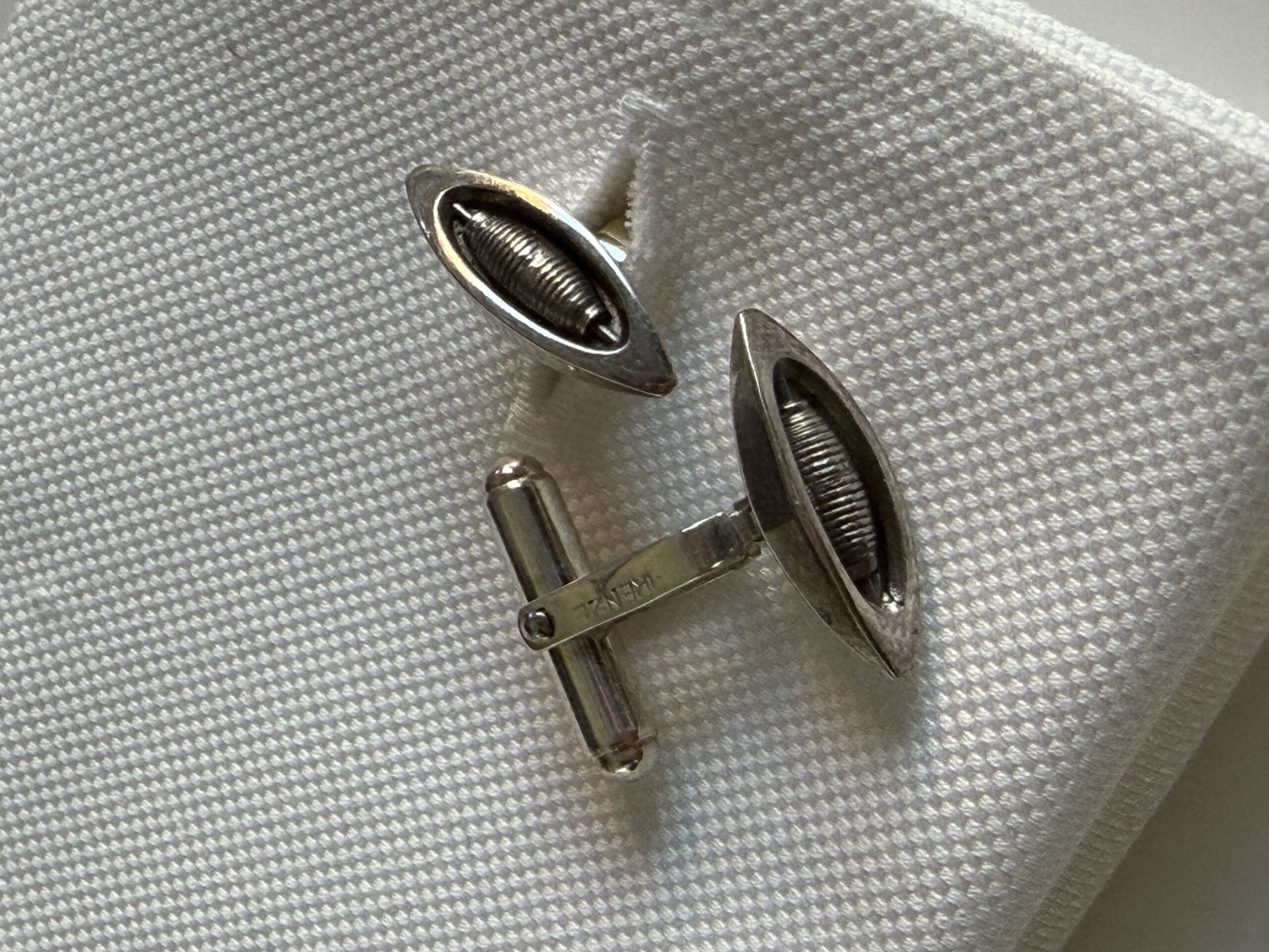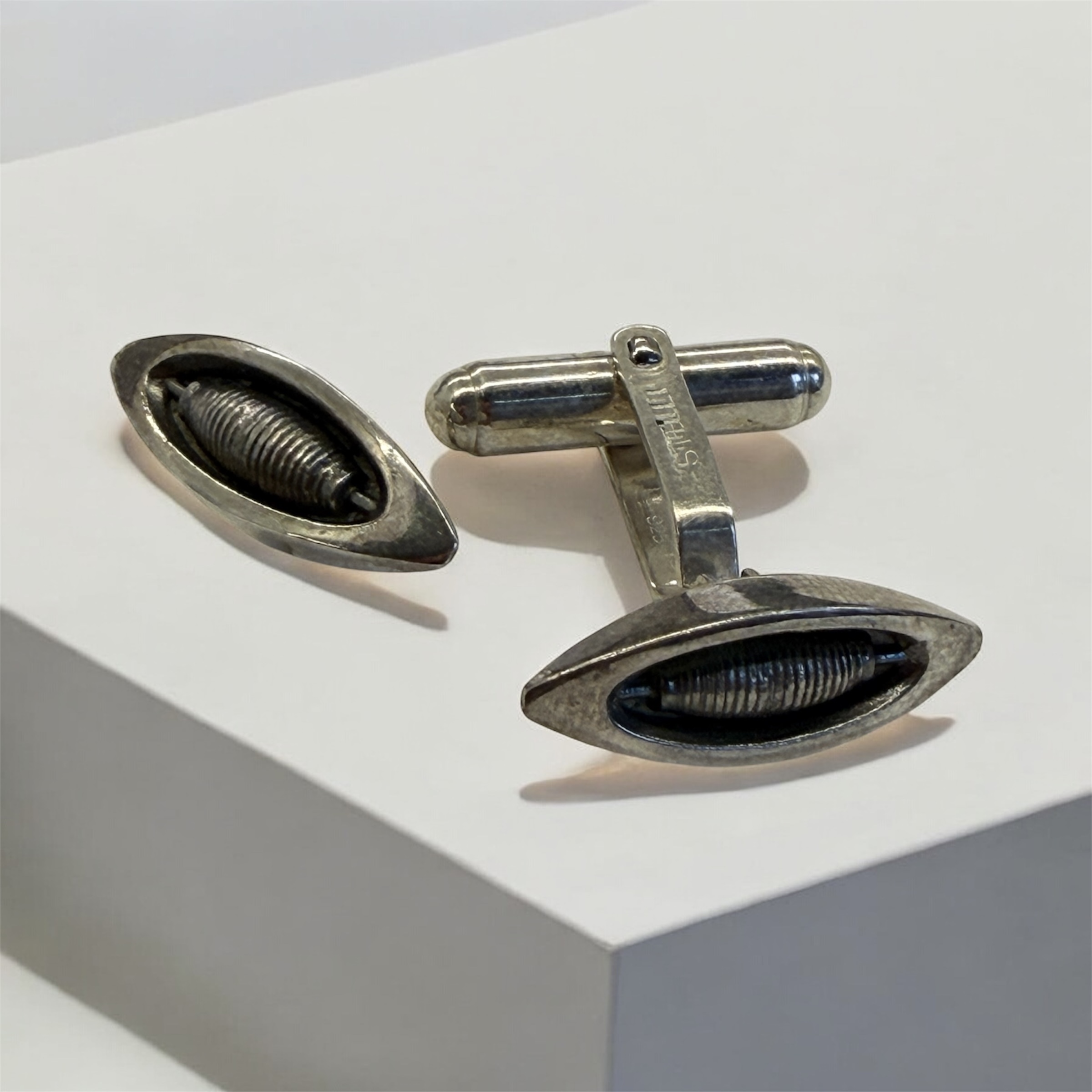 Gemelli con scatto in argento realizzati a mano con la tecnica della fusione a cera persa. Creazione esclusiva di Pestelli Creazioni, liberamente ispirati alla spola che nell’industria tessile è lo strumento nel quale si trova il filato della trama.