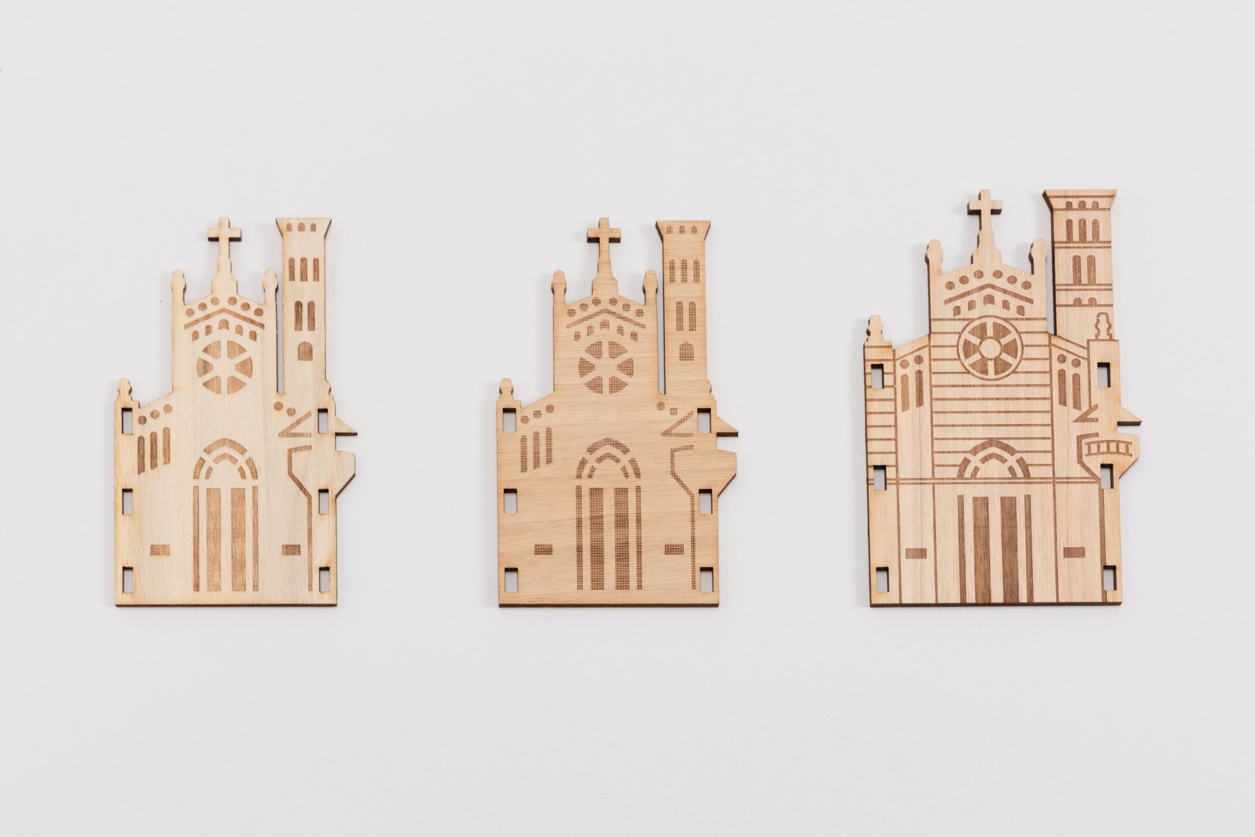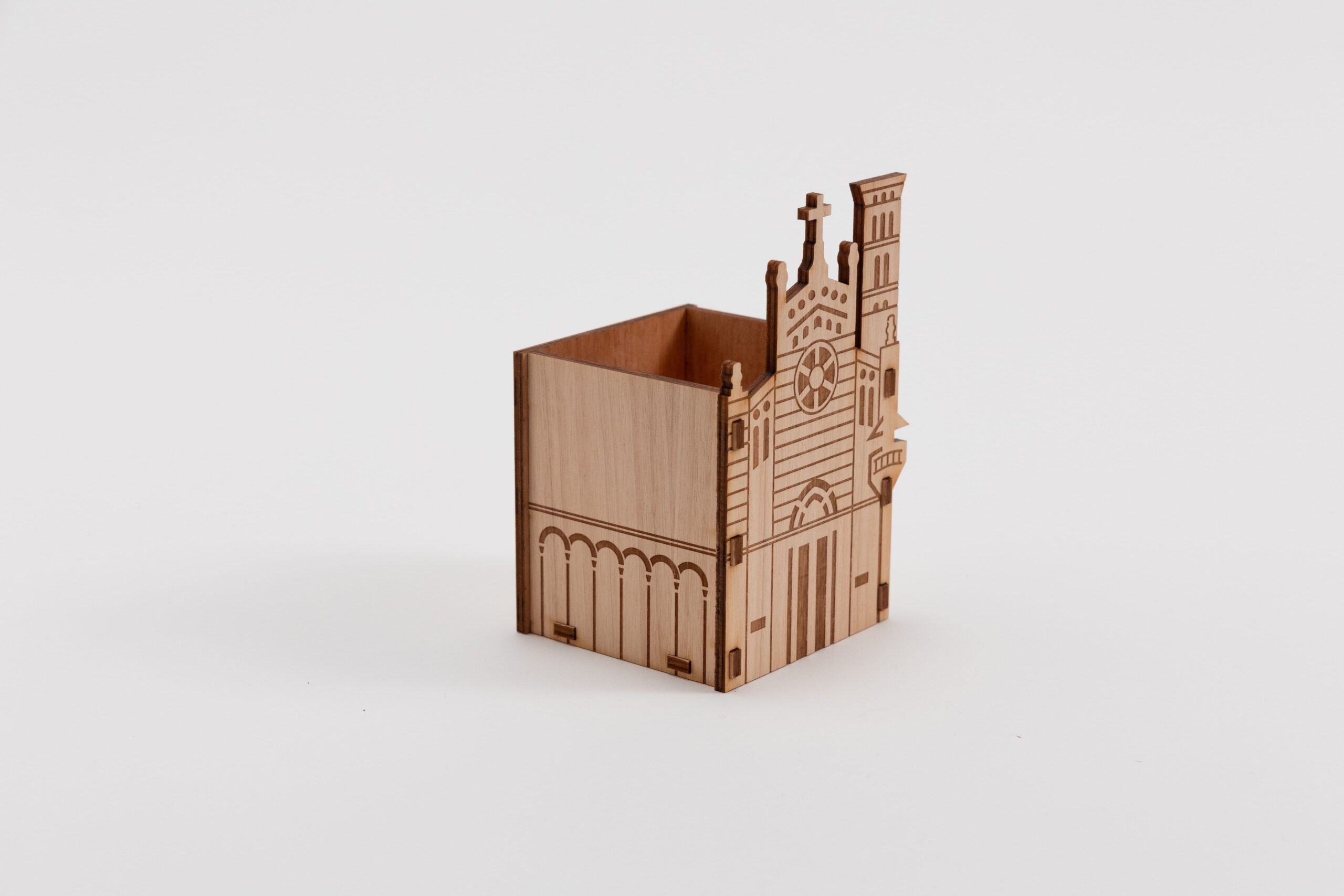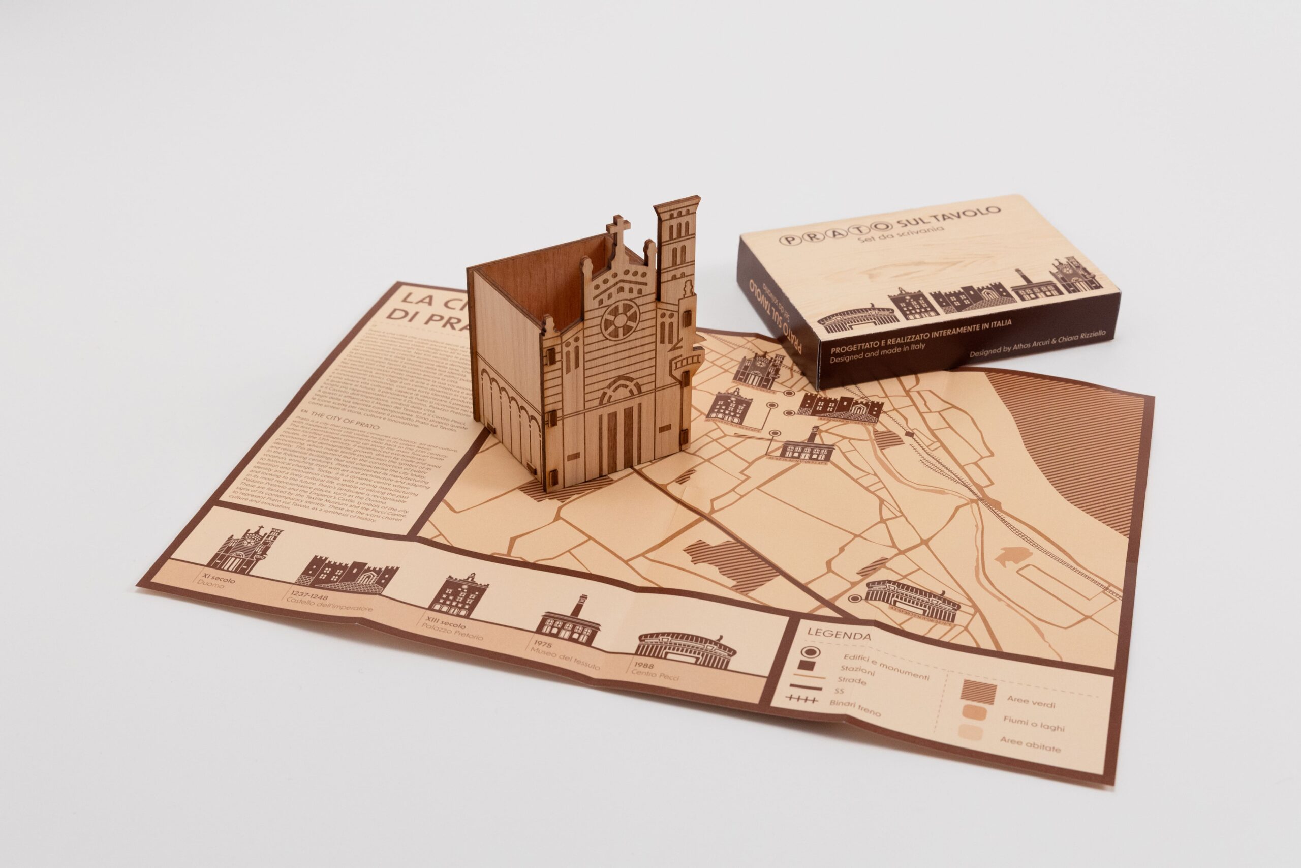 Ogni elemento del set racchiude la storia, l’arte e la cultura di Prato in un oggetto pratico da scrivania. È la stessa forma degli edifici a suggerirne la funzione: Duomo e Palazzo Pretorio diventano portapenne, il Museo del Tessuto un porta post-it, il Centro Pecci un contenitore per piccoli oggetti e il Castello dell’Imperatore un portacarte.